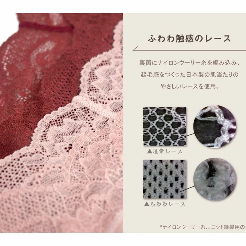 『ふわわショーツ』はふわっとした肌当たりの優しいレース生地を使用+ウエストのクロス設計で、ソフトな穿き心地を実現。
